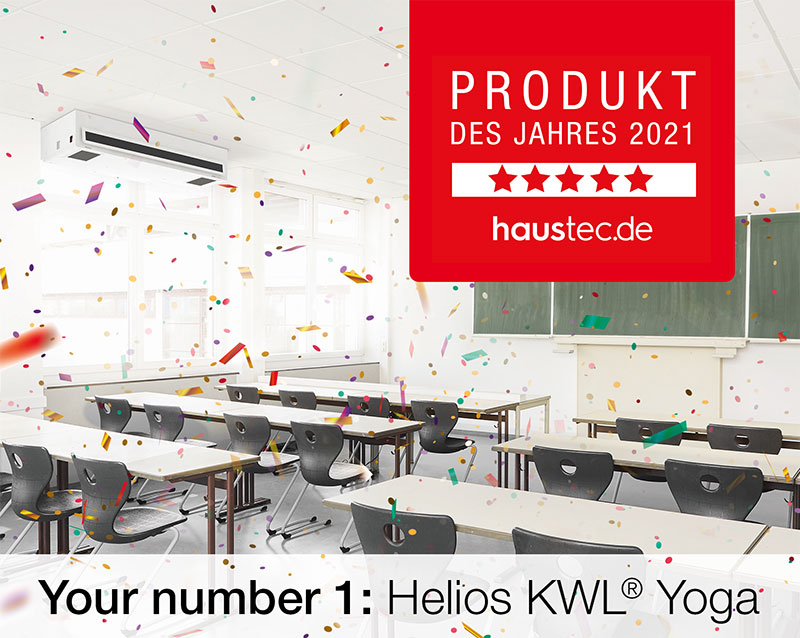 More than 4100 readers voted for their favourites from a wide range of categories in the Haustec.de Awards 2021. Helios was nominated in the "Ventilation" category with its KWL Yoga decentralised ventilation unit. Now it's clear: our ventilation units were awarded first place!